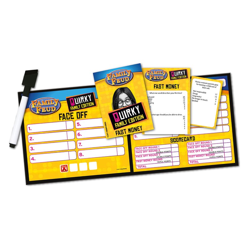 - Includes: 150 Face Off Cards, 50 Fast Money Cards, 1 Emcee Card, 1 Dry Erase Scoreboard, 1 Dry Erase Marker, 1 Instruction sheet