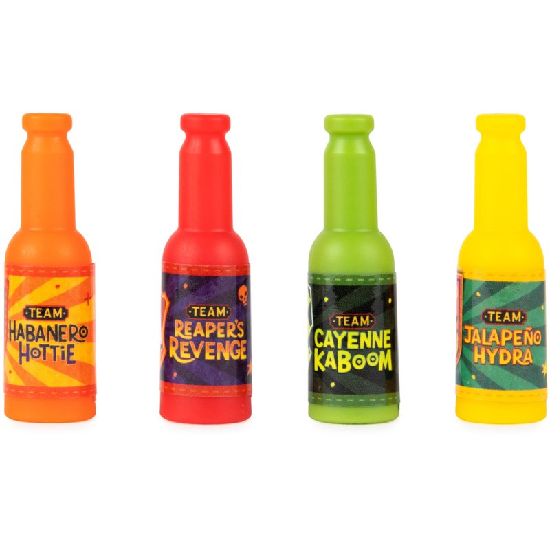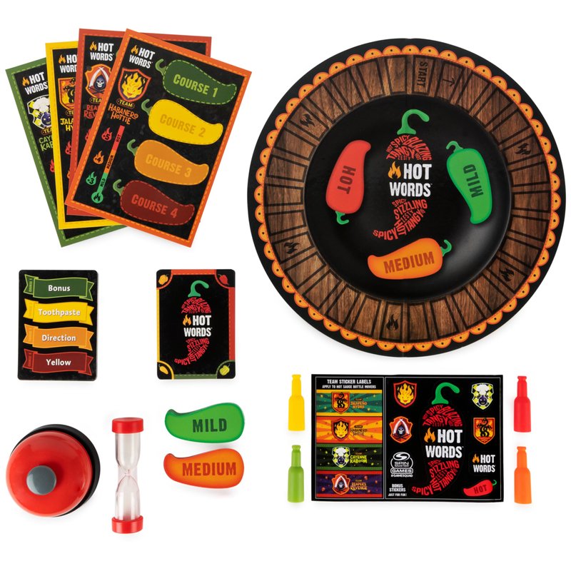 - Includes: 1 Gameboard, 4 Team Tasting Boards, 50 Jalapeño Cards, 150 Word Cards, 1 Sticker Sheet, 4 Hot Sauce Bottles, 1 90-second Sand Timer, 1 Dinner Bell