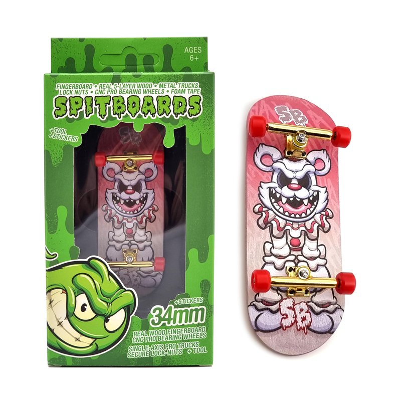 SPITBOARDS 34mm x 96mm Pro Fingerboard Set-Up (Complete) | Real Wood Deck | Pro Trucks with Lock-Nuts and Pro Bushings | Polyurethane Pro Wheels with Bearings | Hahaha Clown