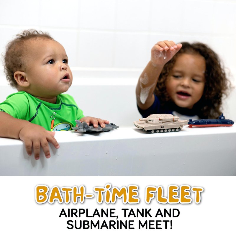 - A WILD TIME - Make water play wildly fun with SplashEZ bath toys! Your baby bath 12-18 months set includes 3 adorable Army-themed dolls - an airplane, a submarine, and a tank!