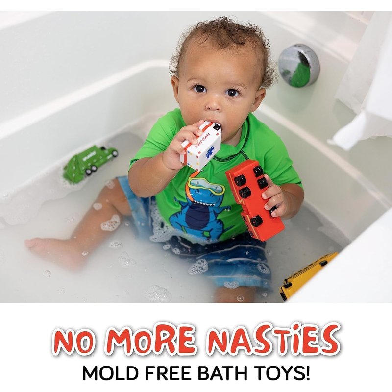 - A WILD TIME – Make water play wildly fun with SplashEZ no mold bath toys! Your baby bath 12 18 months set includes 6 cool vehicles - a fire engine, a police car, an ambulance, a junk truck, a school bus and a dump truck!