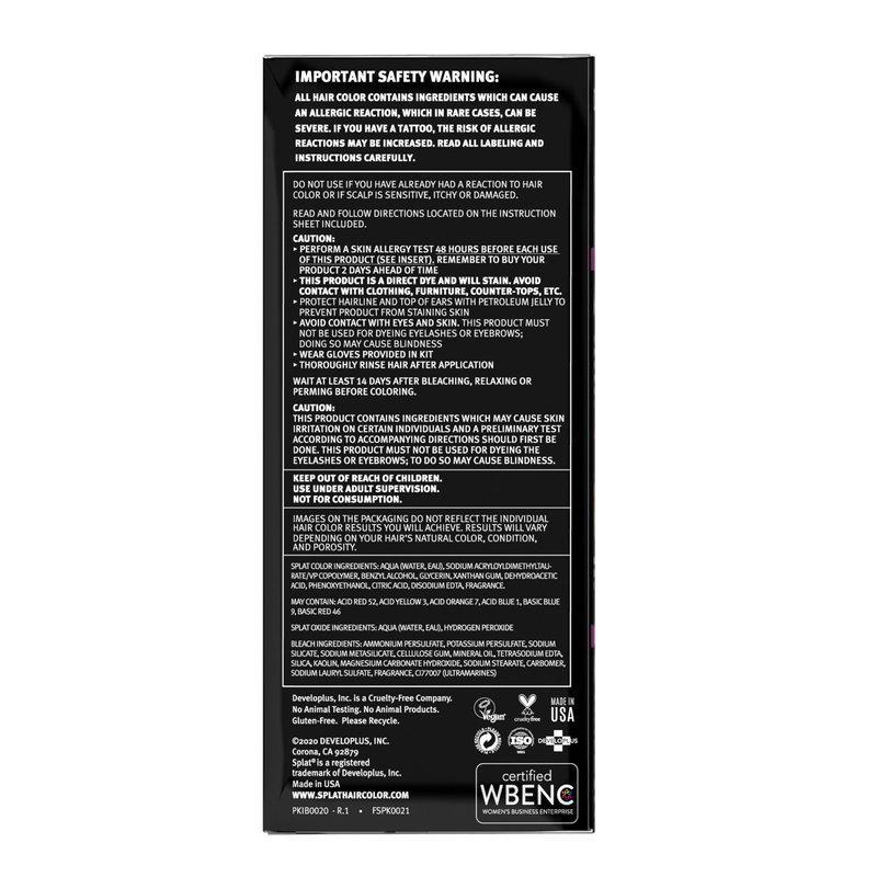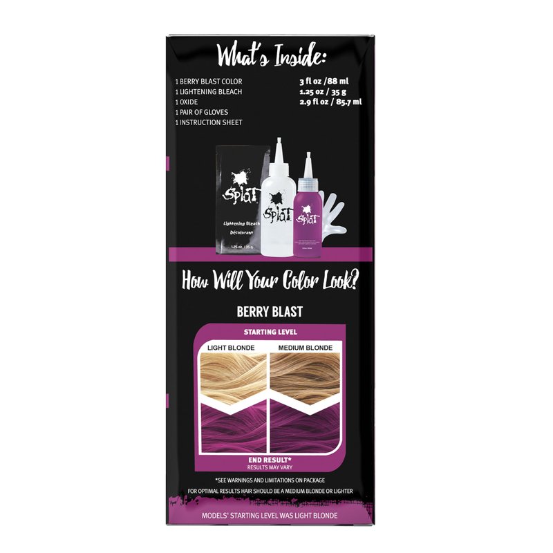 - SEMI PERMANENT HAIR COLOR KIT: Splat Berry Blast hair dye offers vibrant, long lasting bold color. Hair dye kit includes purple pink hair color, oxide, bleach, gloves, and instructions.