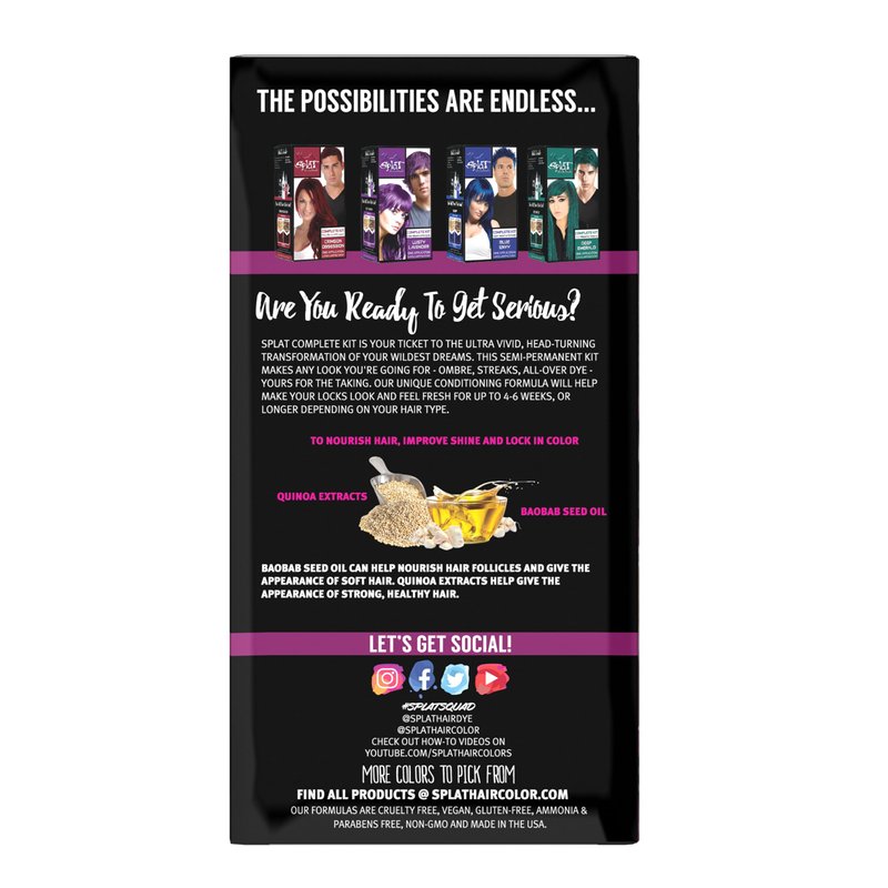 - VERSATILE APPLICATION: Splat hair dye kit is ideal for ultra-vivid looks, including all-over color, streaks, ombrés, or dip dyes. For long or thick hair, 2 or more kits are recommended.