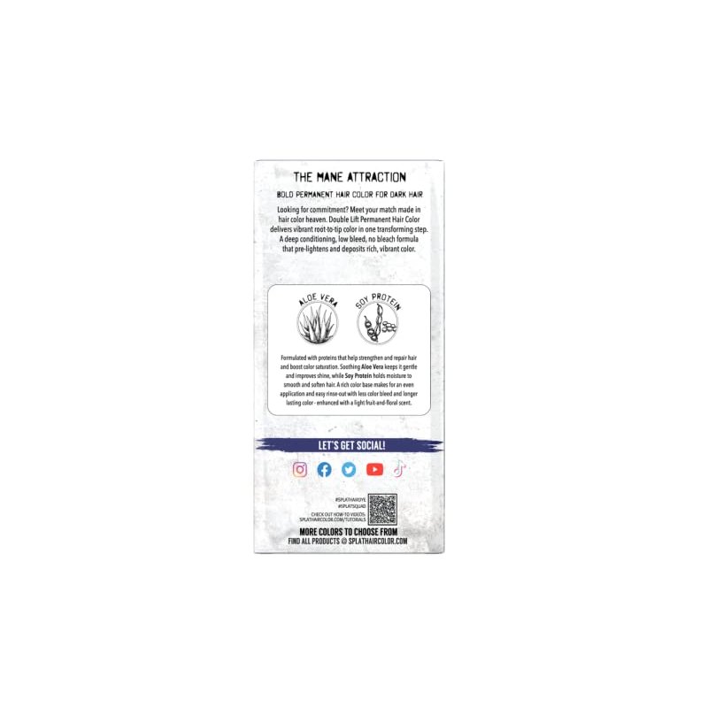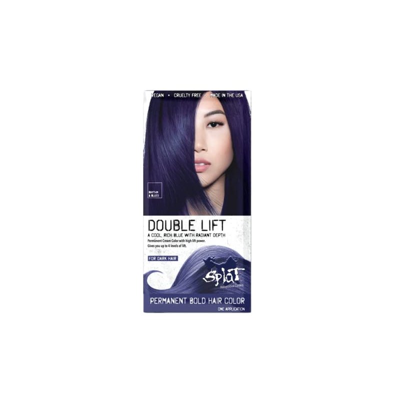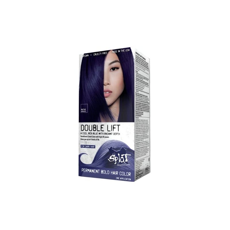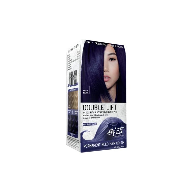 Turn your dark dresses into a bold, vibrant, permanent color in one transforming step with Splat Rhythm & Blues Double Lift Permanent Hair Dye. Made with aloe vera and soy protein, this cool blue permanent hair dye nourishes and hydrates hair follicles, while also providing up to 4 levels of lift, eliminating the need for bleach. No-drip, cream application is easy to apply and won't damage hair strands. Vegan, cruelty-free, and bleach-free, kit includes a 5-ounce bottle of blue hair color, developer, color concentrate, Deep Reconstructor Conditioner, pair of gloves, processing cap, and instructions. Results may vary depending on your hair's natural color, condition, and porosity. See complete instructions for more information and cautions. For long or thick hair, 2 or more kits may be required.