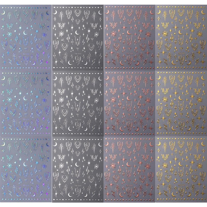 SPLOCUDU 12 Sheets Star Nail Art Stickers 3D Self-Adhesive Nail Decals Silver Aurora Gold Moon Nail Stickers for Nail Art Design Decoration Accessories for Women