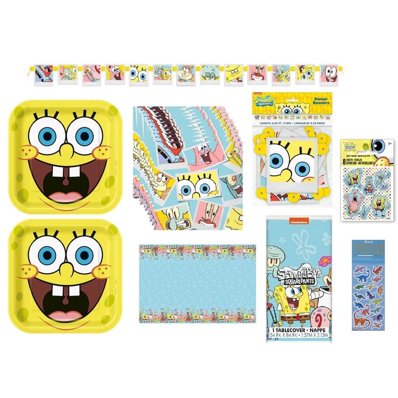 Spongebob SquarePant Birthday Party Supplies Decoration Bundle Pack Includes 16 Lunch Plates 9", 16 Lunch Napkins 6.5", 1 Plastic Table Cover 54"x84", 1 Happy Birthday Banner, 8 Spongebob Sticker Sheets, 1 Esave Dinosaur Sticker Sheet (not Spongebob stickers). Plates and Napkins are Made in USA.