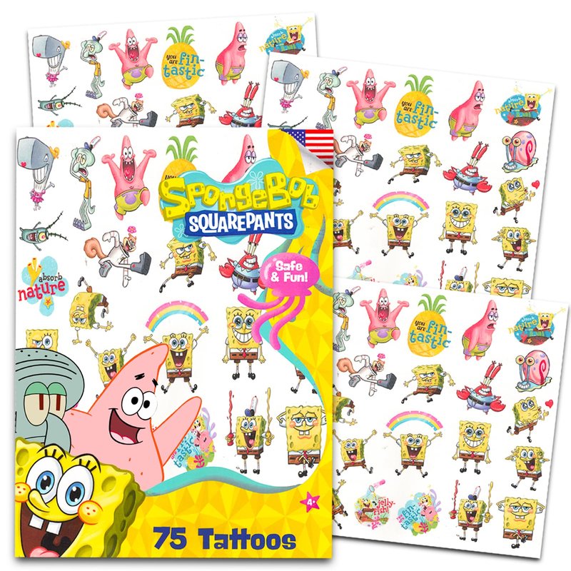 - This Spongebob sticker bundle comes with 3 sheets of temporary tattoos for a total of 75 tattoos featuring favorite characters including Spongebob, Patrick, Squidward, and more.