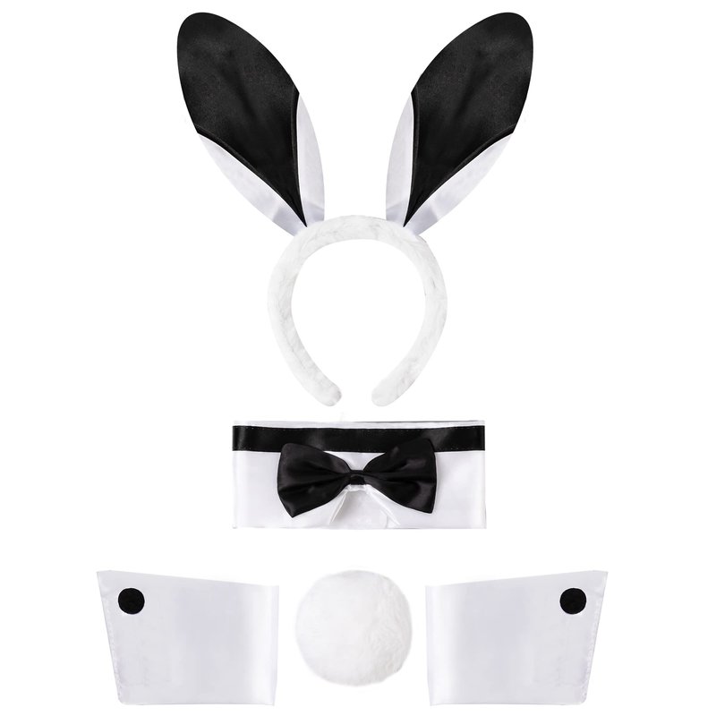 Bunny Costume Set includes bunny ears headband, bow tie, bunny tail, and arm cuffs with unique designs.