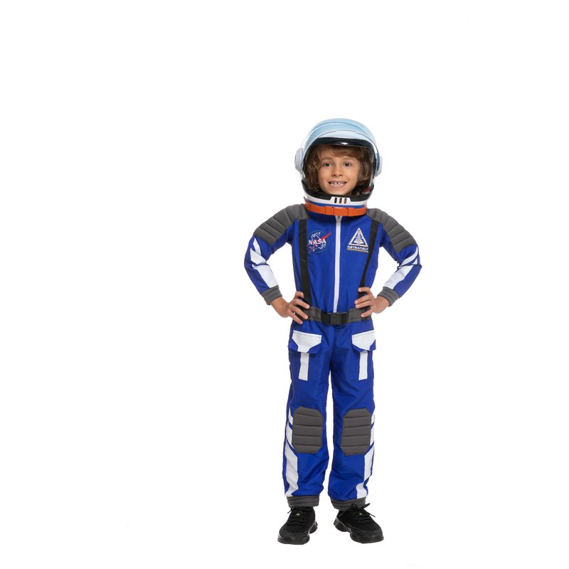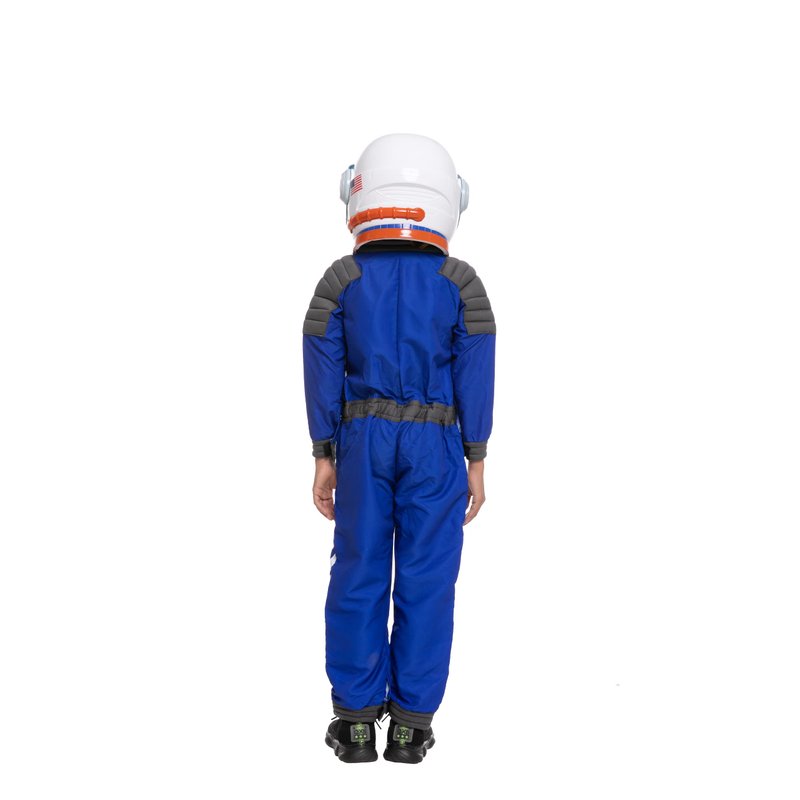 - Astronaut Blue Pilot Costume Includes a Helmet, a Blue Full-Length Front Zip Jumpsuit, Badge, Pocket, and have Black straps. Perfect for your little space traveler!