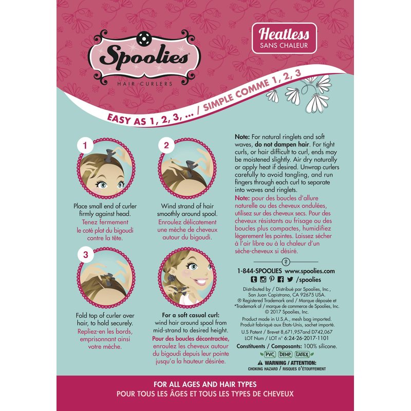 Spoolies Hair Curlers - A Retro Favorite, redesigned with new patented technology and made in the USA. "Create Classic Curls with a Modern Twist." 4 Color Choices! Original 1950s size, called our medium size, has a companion larger size sold as "jumbo" on Amazon. Quality, Integrity, Purity - Spoolies, the curlers millions loved in the 50s are easy to use, and create a variety of hairstyles - such as Beach Waves, Spiral Ringlets, and Classic Pin Curls. Simply wrap the hair around the stem and snap the top over. Medical-grade Silicone is soft and flexible, and Spoolies are durable, lightweight, and portable, so you can take them anywhere . . . even in your carry-on. Spoolies Curlers are 1 3/8", and small by today's standards. They create the size of curl similar to a 3/4-inch to 1-inch curling iron – but No Heat is required. In a hurry? Spoolies are heat resistant and can be used with a hair dryer to activate the curls more quickly. NOTE: Spoolies medical grade silicone has grip, and the curler may get caught in the hair when removing, so wiggle it out with the curl to avoid tangling. We suggest trying one curler to practice how to apply and remove them. :) Spoolies, Inc. donates a portion of profits to charity in support of orphan girls' education projects in Kenya. Buy Spoolies brand products with confidence - 100% Satisfaction Guaranteed. Thank you for your support!