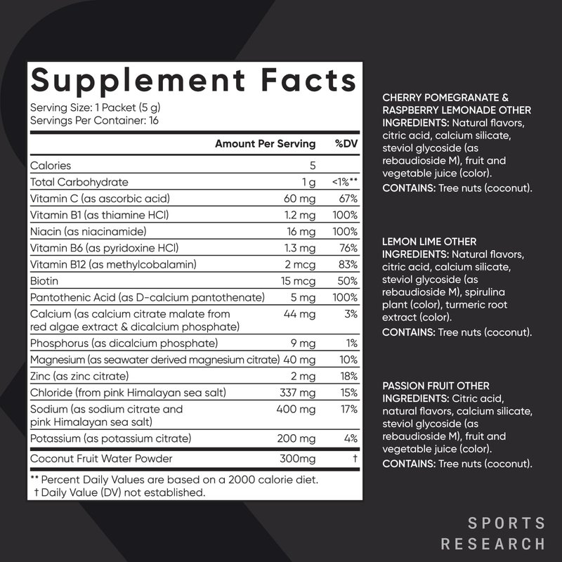 Sports Research Hydrate Electrolyte powder is a sugar-free daily hydrating solution that easily mixes into any beverage. Made with 400 mg of Sodium and 200 mg of Potassium, over 65 trace minerals, seven essential vitamins, and Coconut Fruit Water Powder, it’s a powerful blend of ingredients that helps supports your wellness from the inside out. Our Electrolyte mix comes in four flavors (raspberry lemonade, cherry pomegranate, lemon-lime, and passion fruit) and a variety pack. Each box contains 16 sachets you can take with you on the go, whether doing more hardcore exercise or simply doing your daily activities.