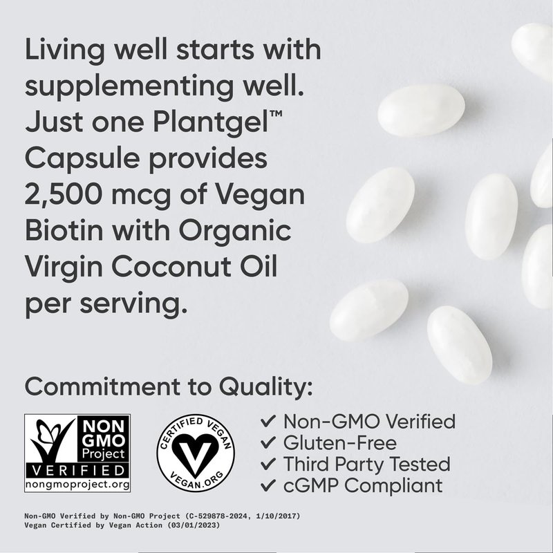 - VEGAN CERTIFIED: Our biotin is Vegan Certified and encapsulated in the world’s only non-GMO verified, bovine, and carrageenan-free, Plantgel capsule. It’s filler-free, formulated with organic coconut oil, and Manufactured in the USA in cGMP-compliant facilities