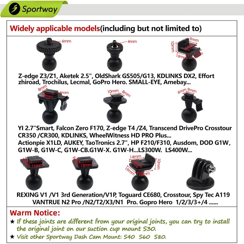 - ★S30 with 10pcs different joints, suitable for most popular brand dash cam, such as REXING,Z-Edge,Old Shark,YI,KDLINKS,Falcon Zero,Transcend,Crosstour,VANTRUE,Black Box,GoPro Hero......For the corresponding brand and model, please check the picture