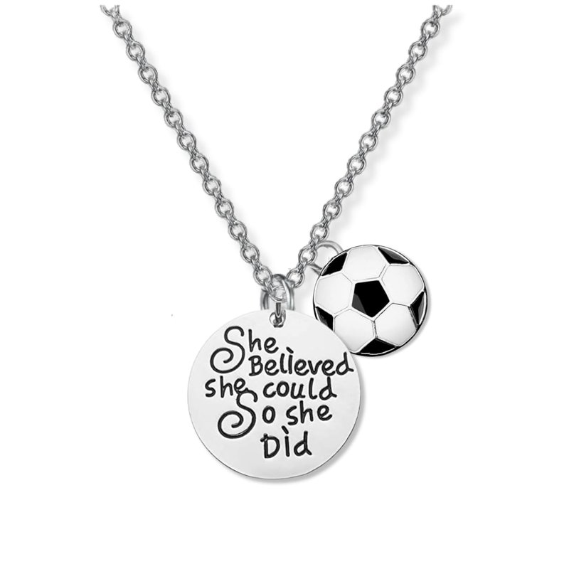 Sportybella - Soccer Charm Necklace, Engraved (She Believed, She Could, So She Did) Pendant Necklace, Personalized Necklace with Inspirational and Soccer Charm, Personalized Gifts for Women