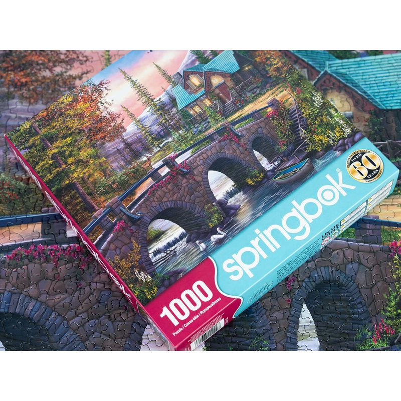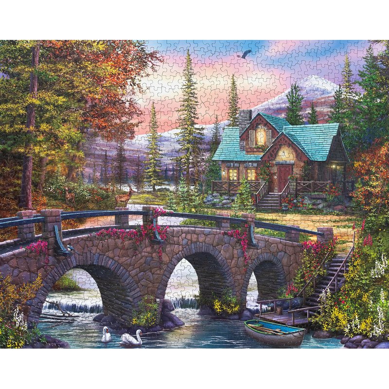 - This 1000 piece jigsaw puzzle depicts a picturesque mountain retreat with a stone bridge over a tranquil river, where swans are swimming. A canoe rests on the bank nearby. In the background, a charming cottage is surrounded by lush greenery and autumn trees, set against snow-capped mountains. The scene exudes serenity and natural beauty.
