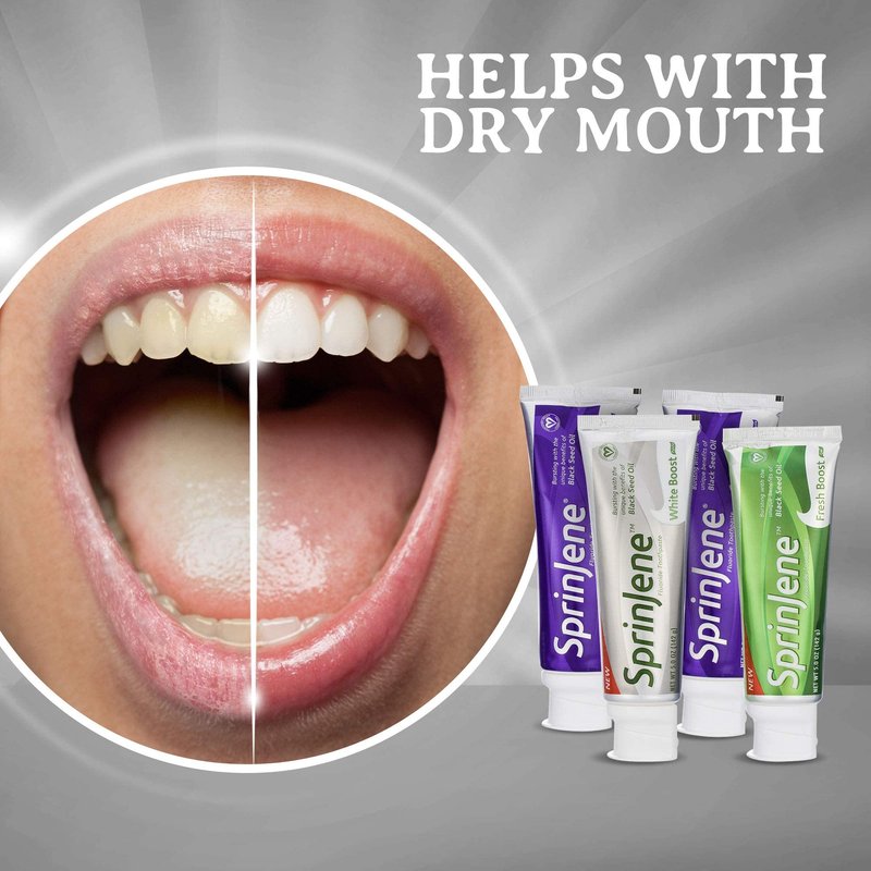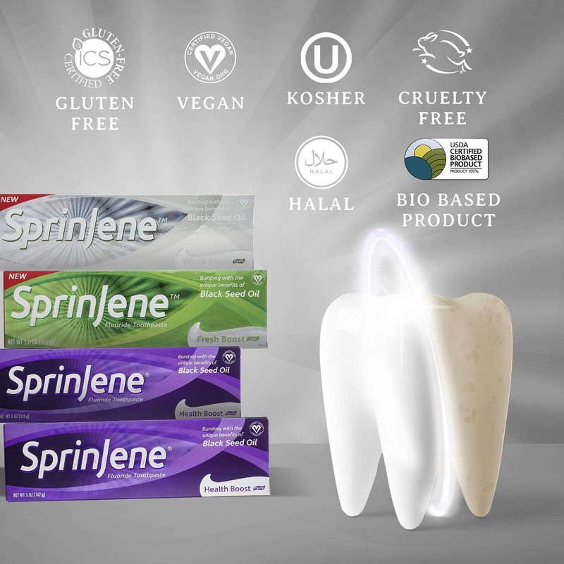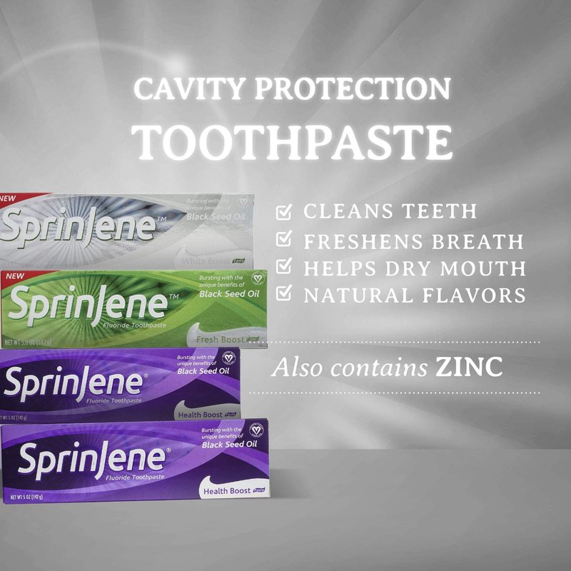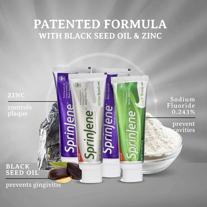 - GREAT TASTING AND EFFECTIVE FRESH BOOST: Boost your oral routine with SprinJene’s Fresh Boost patented black seed oil + zinc toothpaste. Tastes great and freshens breath! With fluoride to control the growth of tartar and plaque biofilms.