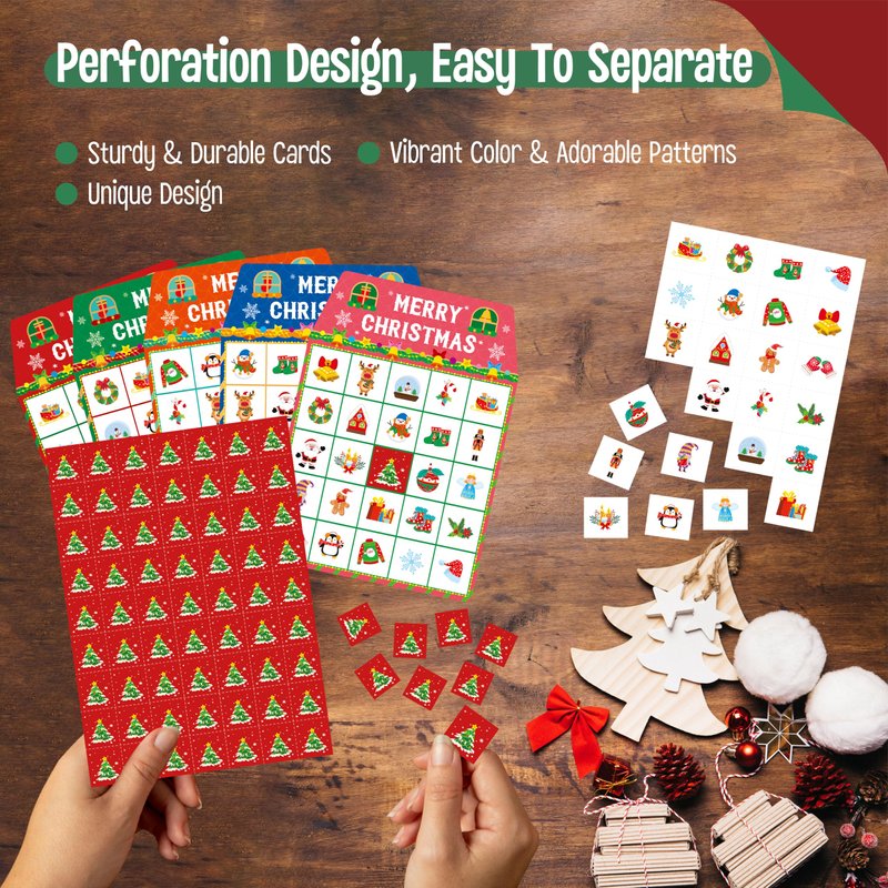 Eye-catching & Vibrant: The bingo game set is designed in vibrant colors and a variety of adorable patterns with Christmas Day elements like Santa Claus, gingerbread man, crystal ball, etc. Each image is brightly colored and printed. These attractive and vivid designs make the game more interesting.
