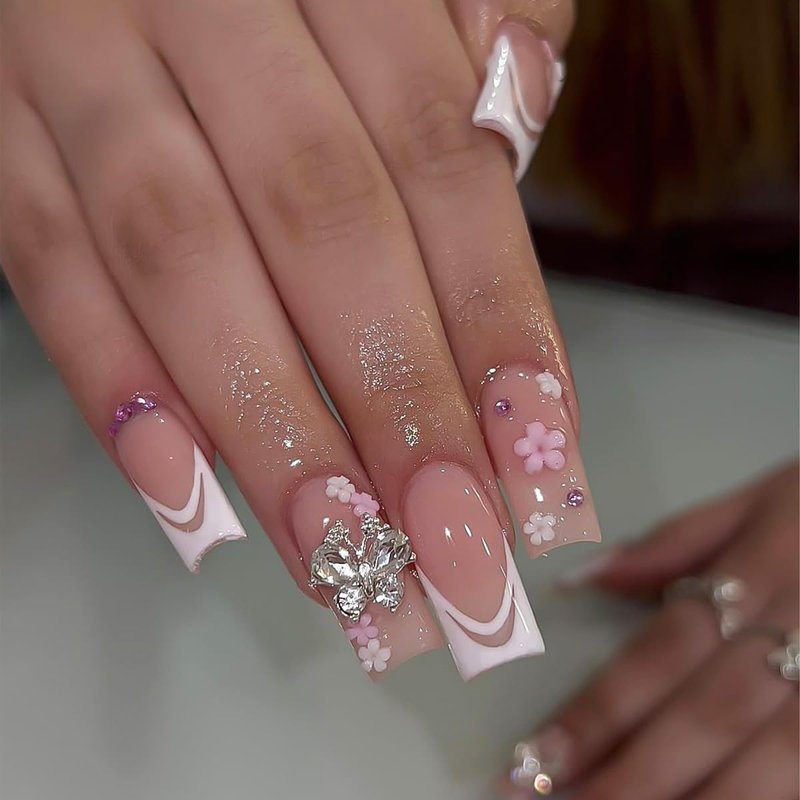 Square Press on Nails Medium French White Tip Fake Nails Acrylic False Nails with 3D Butterfly 3D Flowers Designs Rhinestones Artificial Nails Full Cover Nails Press ons Stick on Nails for Women 24Pcs