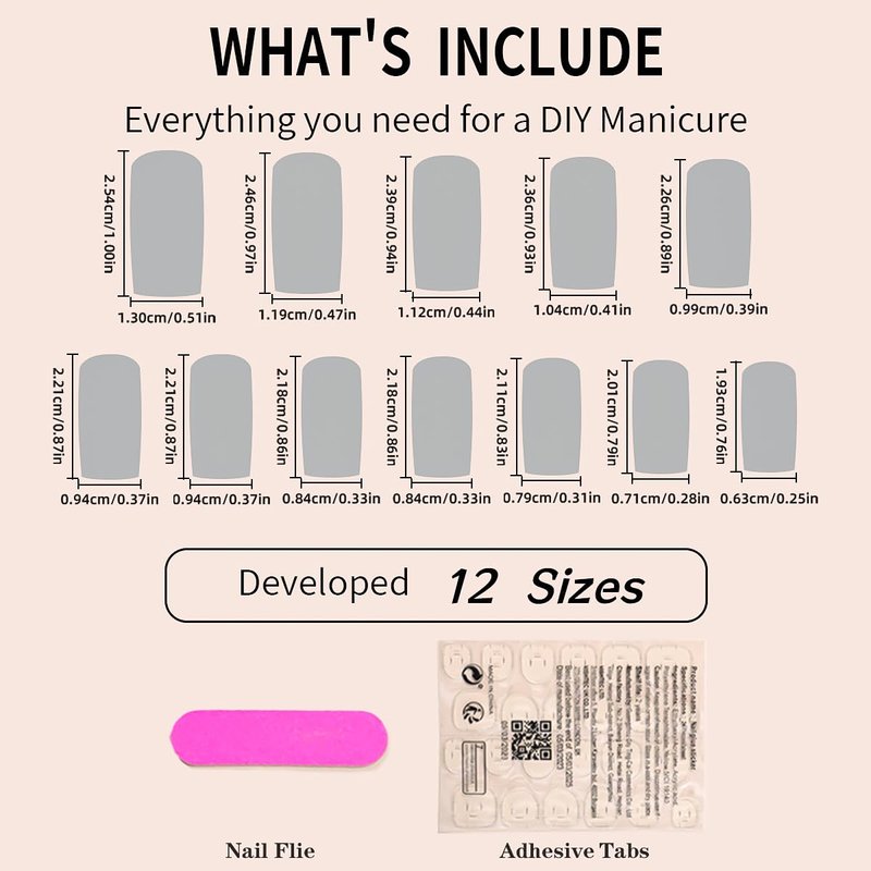Product Description Feature 1. There are a total of 24 pcs fake nails, including 12 sizes, you can DIY your unique nail art. 2. Our nails are made of high-quality materials, will not harm your nails or body, using 100% safe and healthy materials. 3. In just 5 minutes, you can get the same shiny look yourself instead of spending half an hour paying for an expensive manicure at a nail salon. 4. Suitable for professional, nail art school/college, nail art artist and personal/home use, etc. 5. Suitable for nail salons and DIY nail art at home, wonderful gift for your wife, Girlfriend, Mother or sisters, And excellent for Parties/Wedding/Costume Ball. How to Use: 1. Gently sand the surface of your nails, rinse and dry. 2. Choose suitable false nails and apply jelly glue on the back of the false nails. 3. Press the fake nails on your nails and hold for 25 seconds. 4. Trim according to the nail shape and length you want. How to remove fake nails: 1. Soak your nails in warm water for 3-5 minutes. 2. Wait for the false nails to loosen, then gently remove the false nails and remove excess nail glue. 3.Fake nails can be reused after nail removal, you can keep the fake nail tip for next time use. Precautions: 1. Do not touching water within 1 hours after wearing 2.Please do not leave the nail in water for a long time, it will make the nail easy to fall off.