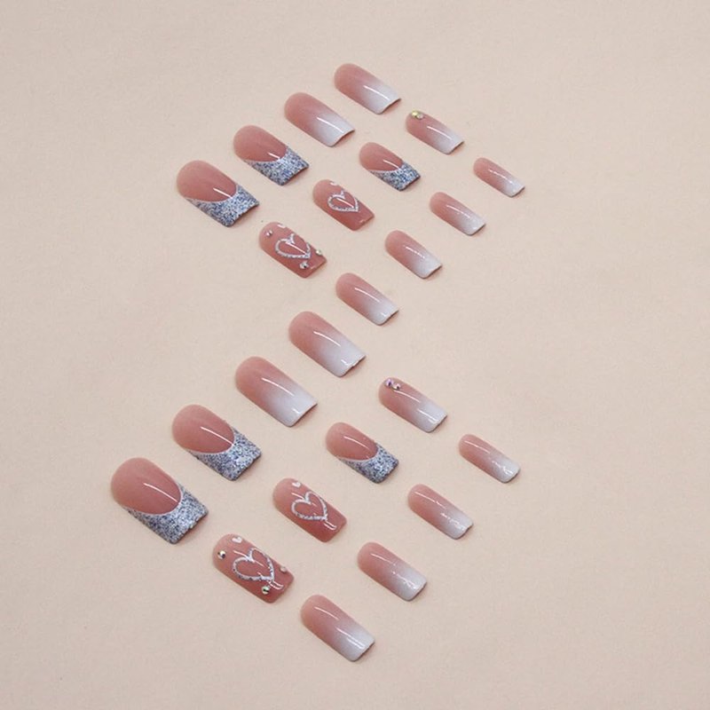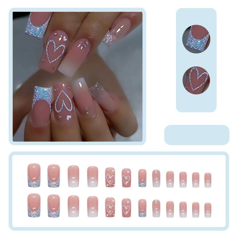 Square Press on Nails Medium Length - French Tip Press on Nails Heart Deign, Glossy Pink Fake Nails with Adhesive Glue Stickers, Reusable Stick on Nails in 12 Sizes, 24 Pcs Medium French Nails
