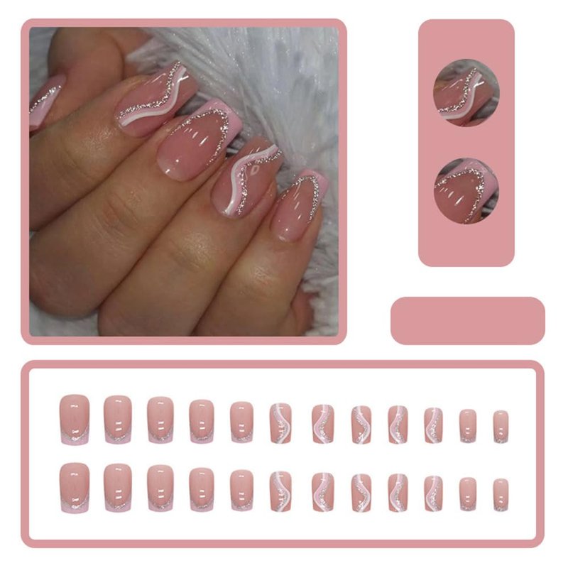 Square Press on Nails Medium Length - French Tip Press on Nails Pink and White Stripes Design, Gold Glitters Fake Nails with Adhesive Glue Stickers, Reusable Stick on Nails in 12 Sizes, 24Pcs