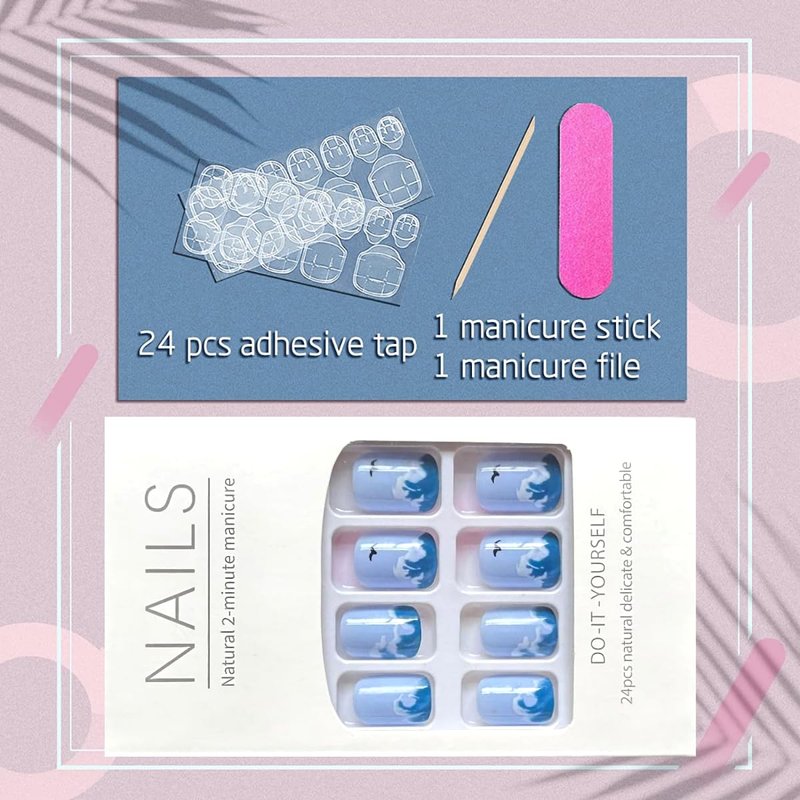 - Package Includes:You will get 24 pieces blue press on nails with 12 different sizes,1 piece nail file,24 pieces nail jelly glue,1 piece wooden stick for removing fake nails.