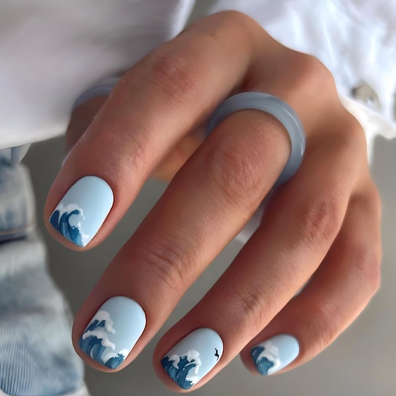 Square Press on Nails Short Blue Fake Nails with Ocean Designs Artificial Glossy False Nails Acrylic full cover Glue on Nails for Women 24Pcs
