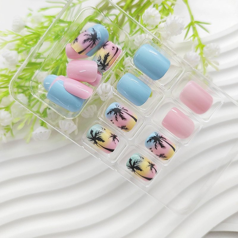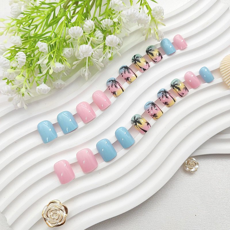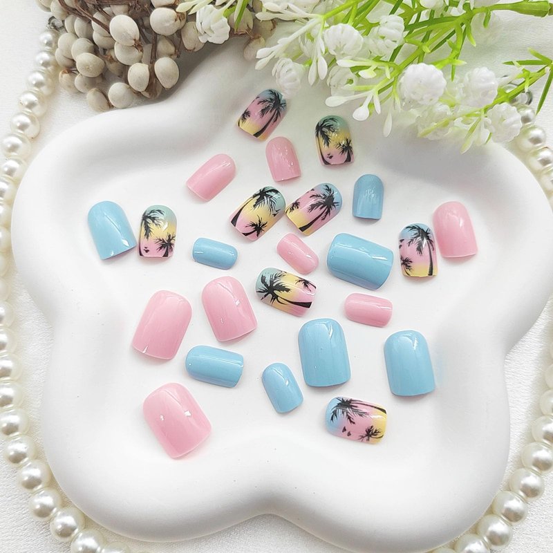 Square Press on Nails Short Fake Nails Pink with Blue Full Cover Glue on Nails Black Coconut Tree Sand Design False Nails Press ons Glossy Acrylic Nails Artificial Stick on Nails for Women 24Pcs