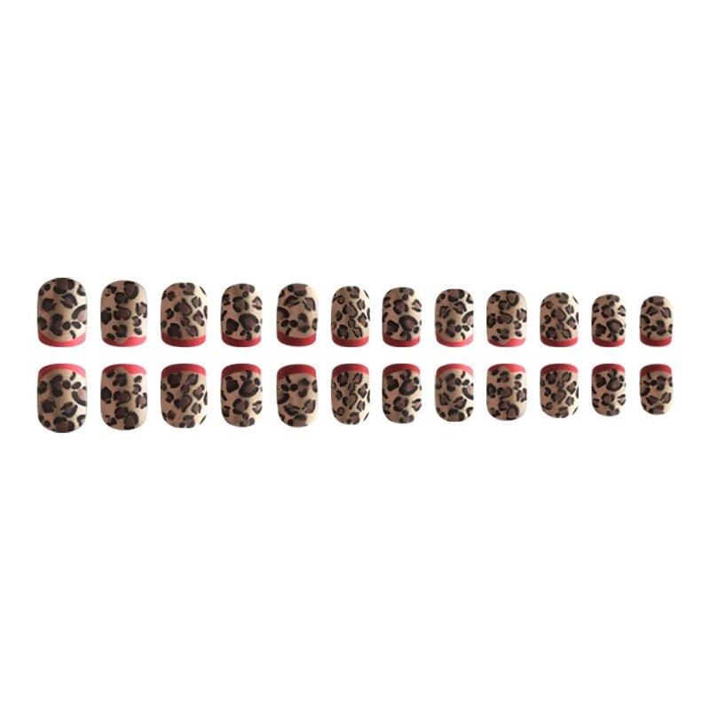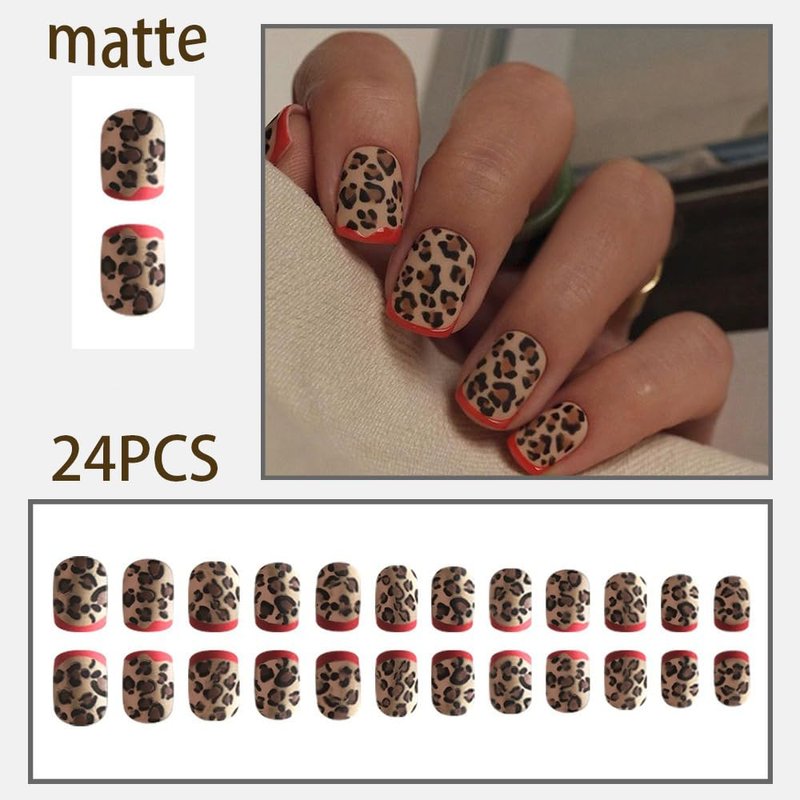 Square Press on Nails Short French Tips Fake Nails Acrylic Dark Brown with Leopard Print Design Matte Glue on Nails Short Square False Nails Artificial Full Cover Stick on Nails for Women 24PCS