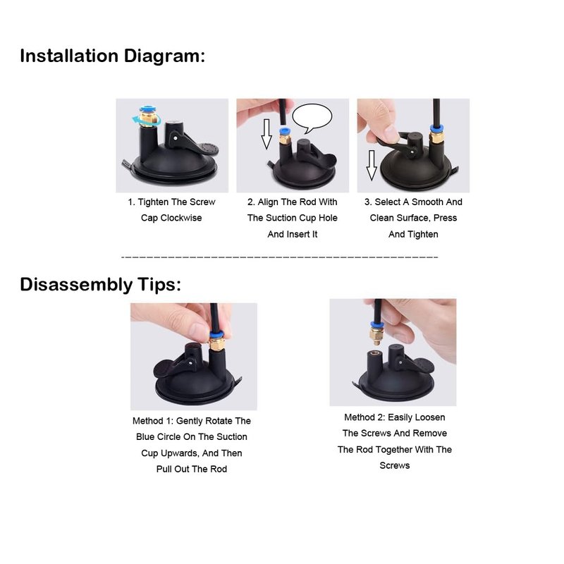 - Usage Tips: Keep The Adsorption Area Smooth, Clean, And Free From Moisture. 2.3. After Fixing The Suction Cup, Minimize Movement As Much As Possible And Do Not Use It In High-Temperature Environments, As This Will Irreversibly Affect The Suction Force. 4. If The Suction Cup Is Not Sticking, Please Clean It With Clean Water And The Suction Cup Will Stick Back Together.