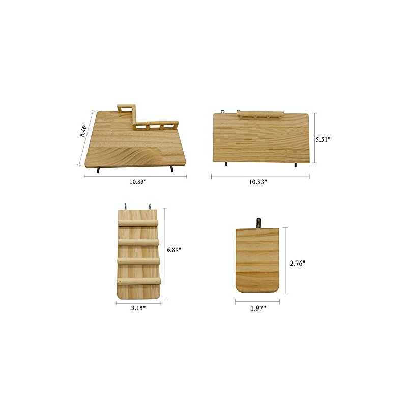 L-shaped wooden platform: 10.83 "(W) x 8.46 "(L) x 0.44 "(H), Rectangular guardrail wood panel: 13.19 "(W) x 5.51 "(L) x 0.44 "(H), Ladders: 3.07 " x 7.09 ", Square Step Board: 2.76 x 1.97 "