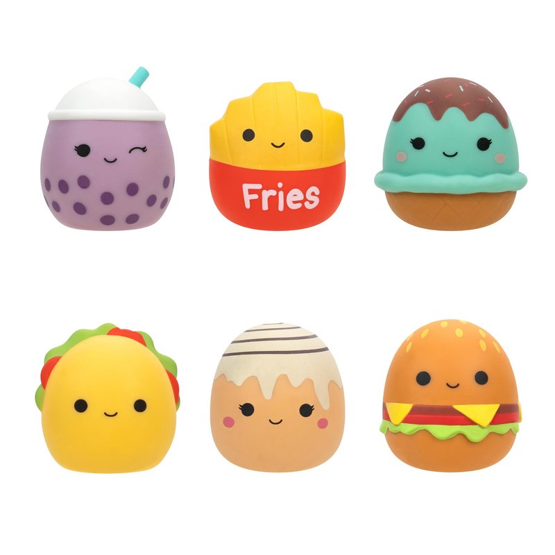 - Each mystery blind bag features your favorite Squishmallow food character as a mini squishy figure! Including: Chanel the Cinnamon Roll, Tex the Taco, Poplina the Boba, Carl the Cheeseburger, Floyd the French Fries & Maya the Ice Cream