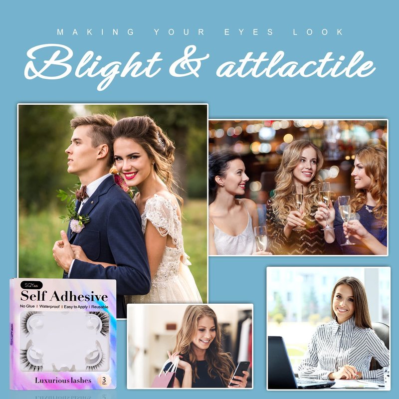 SQYlashes Glueless Lashes, Adhesive Lashes no Glue, Stick on Lashes, Self Adhesive Eyelashes Natural Look, Reusable and Waterproof (Black Color, 3 Pairs)