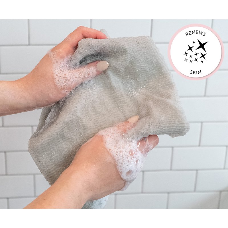 - Pair the shower cloth with your favorite body and skincare products to produce a lather or use dry to gently brush off dead skin