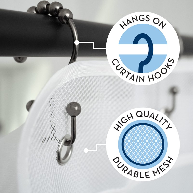 - 100% polyester mesh shower caddy dries fast; hand wash only