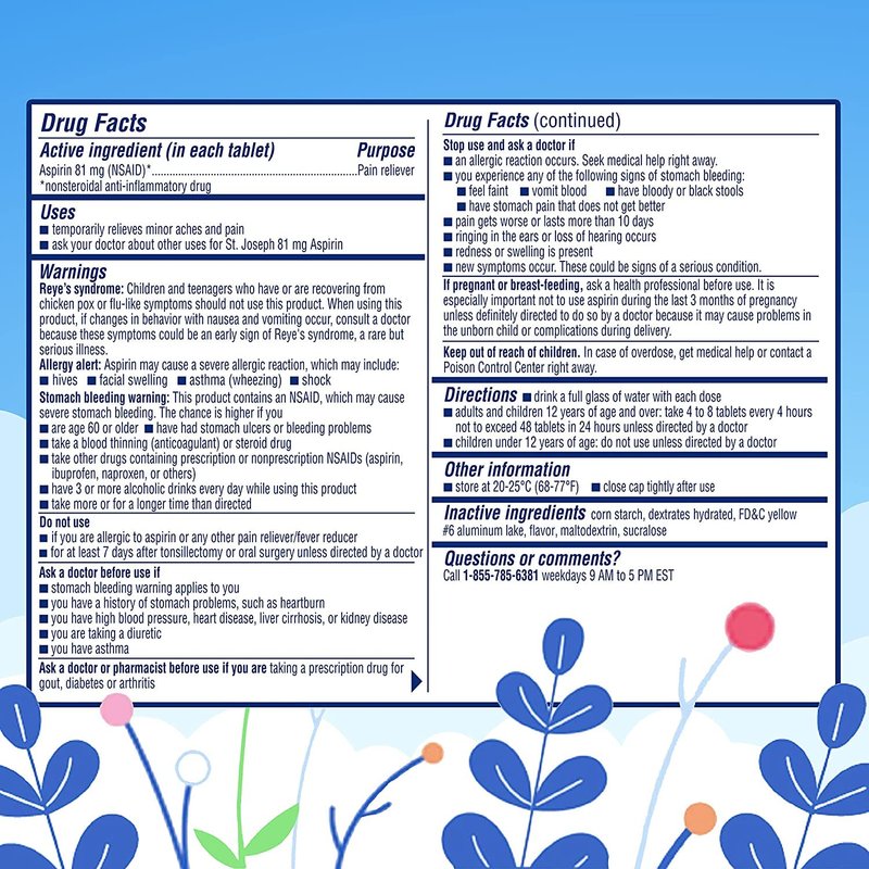 St. Joseph Low Dose Aspirin Orange Flavored Chewable makes it easy to swallow and is a good option for those who have difficulty swallowing pills or tablets. This is not enteric coated, it will begin to dissolve as soon as you chew or crush it. Aspirin therapy is not always right for everyone, so consult your doctor before you start or change an aspirin regimen. NDC Code(s): 69536-281-36