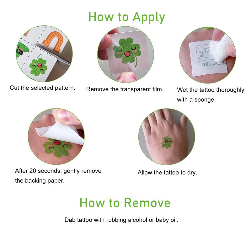 - Nice Makeup For Adults And Kids: Your kids can not wait St Patricks Day. A great deal for kids having fun. St Patricks Day accessories shamrocks tattoos can be stuck well on your arm, face, hand, or anywhere you like. Just be careful for sensitive skin.