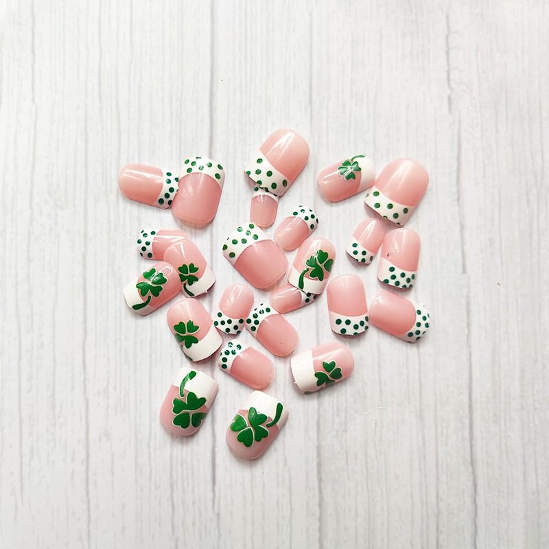 - 【Package Contents】: You will get 24 pcs french tips square nails with cute shamrocks pattern designs, 1 pcs nail file, 24 pcs of jelly glue and 1 pcs wooden stick.