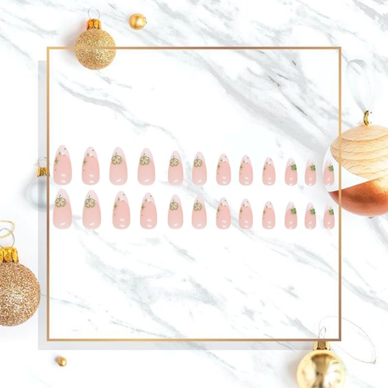 24Pcs St. Patrick's Day Press on Nails Almond Medium Green Four Leaf Clover Fake Nails for Women Manicure Decorations