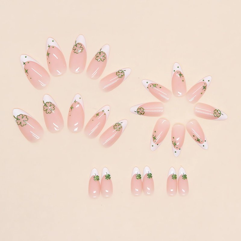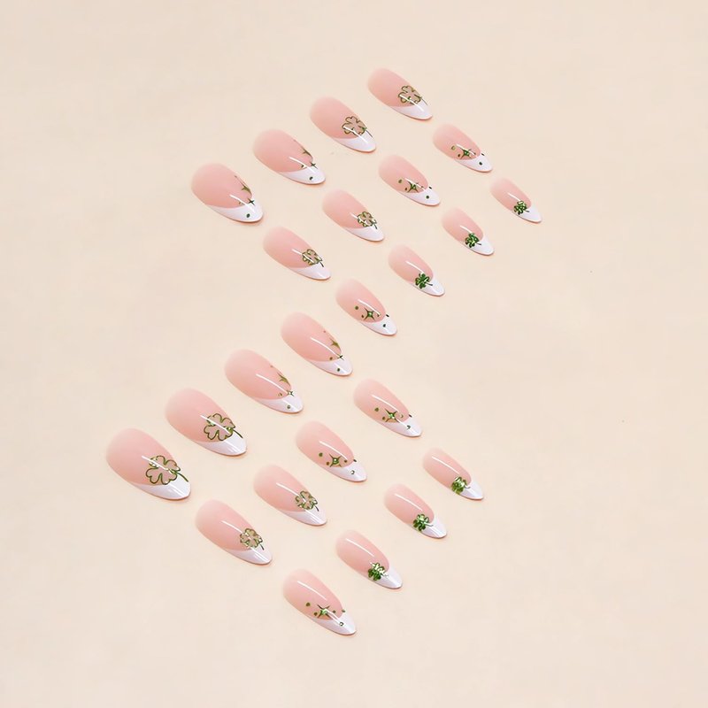 - šćCute French Clover Nail DesignsćAlmond press on nails are designed with white french tips and cute clover stars, which are very suitable for St. Patrick's Day party. These acrylic press-on nails are sure to make a statement and elevate your St. Patrick's holiday look.