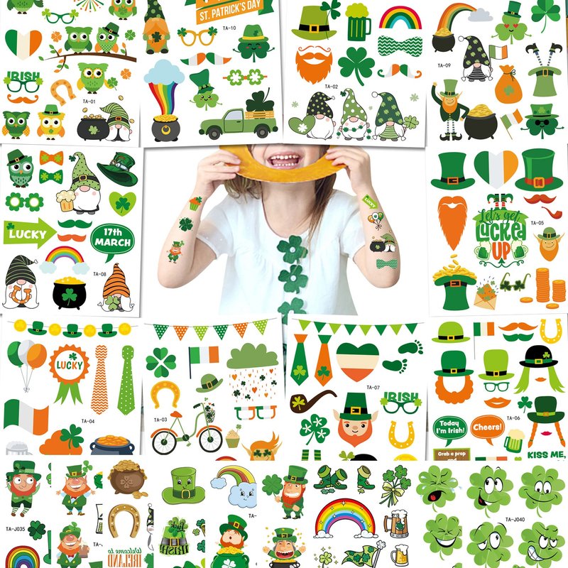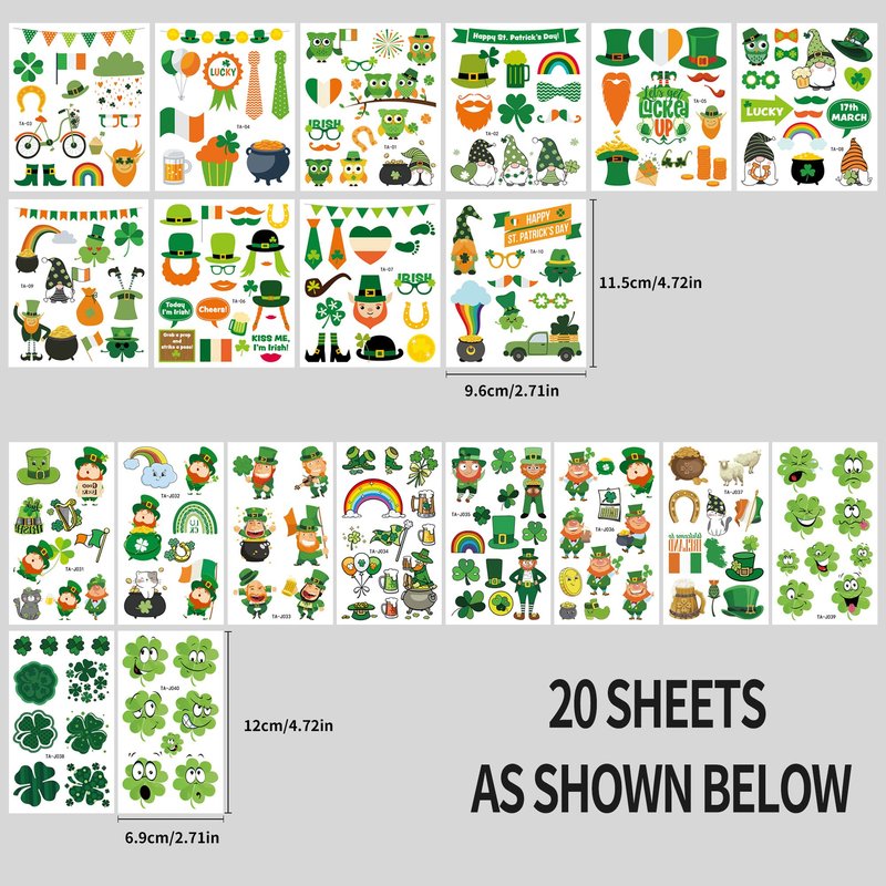 - ☘️【Perfect for St Patrick's Day Decoration】The combination of 10 big and 10 small st patricks tattoos are quite perfect,The lucky shamrock is the classic element of St Patrick's Day.These temporary tattoos so cute and perfect for our St Patrick's Day celebration.These St Patrick's Day temporary tattoos make you and your families and friends luckier and attractive, a big hit in st. Patricks Day Parade.