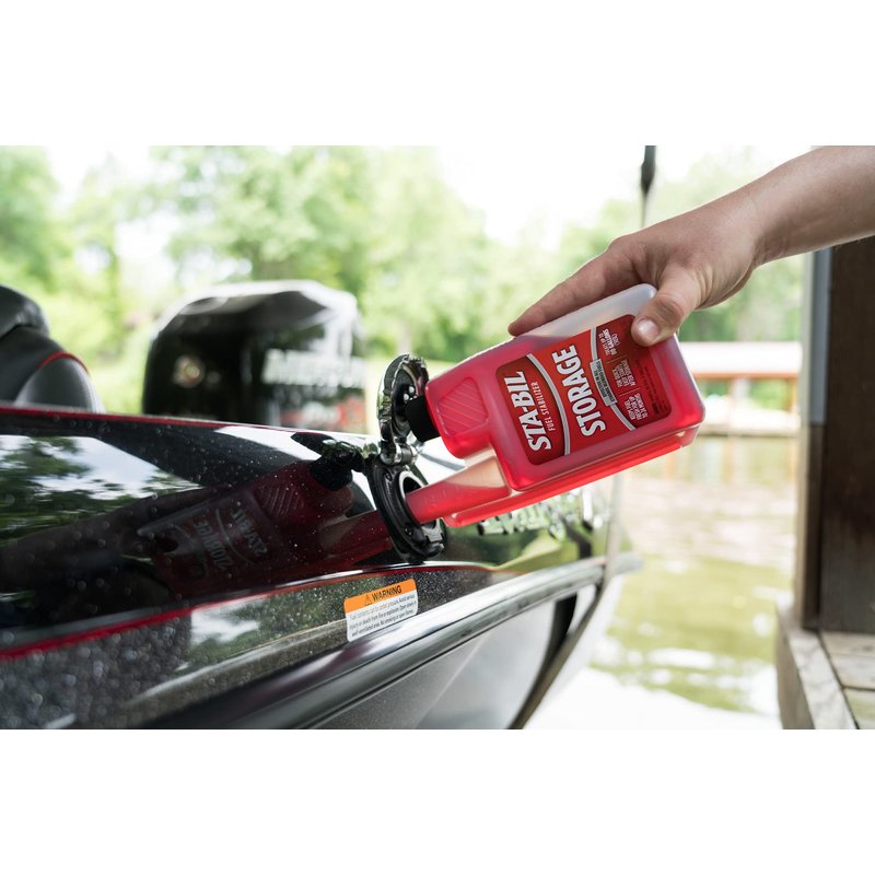 - Directions - Pour contents directly into the fuel tank before adding gasoline. Use 1 oz of STA-BIL Storage for every 2.5 gallons of gas. After adding the fuel, run the engine for 5 minutes to treat the entire fuel system