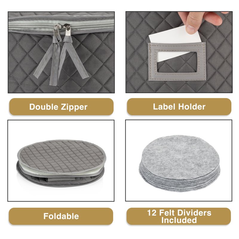CONTENT: One plate case for small plates, 8" diameter by 6" height. It includes 12 felt plate separators for protection against chipping and scratching. PREMIUM MATERIAL: Made from Premium Polyester with non-slip texture with label holder and zippered closures. CARE: Hand wash with warm soapy water and lay flat to dry; or wipe with wet cloth as needed.