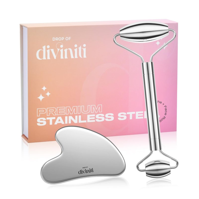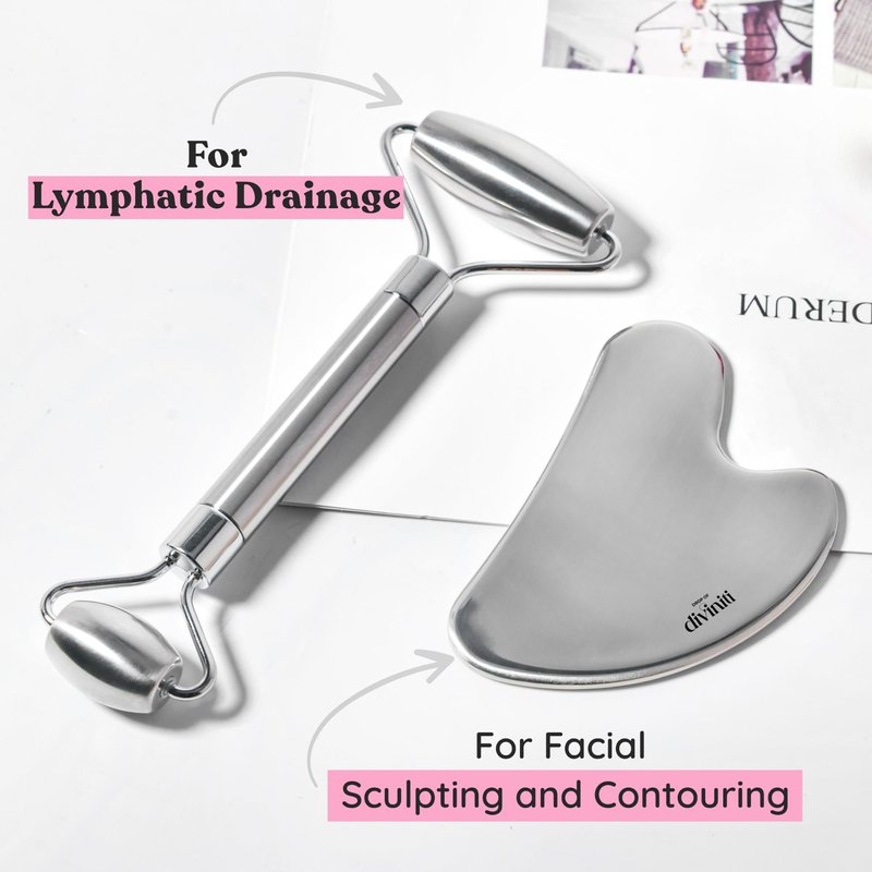 Transform your skincare routine with our Premium Stainless Steel Gua Sha & Face Roller Set.