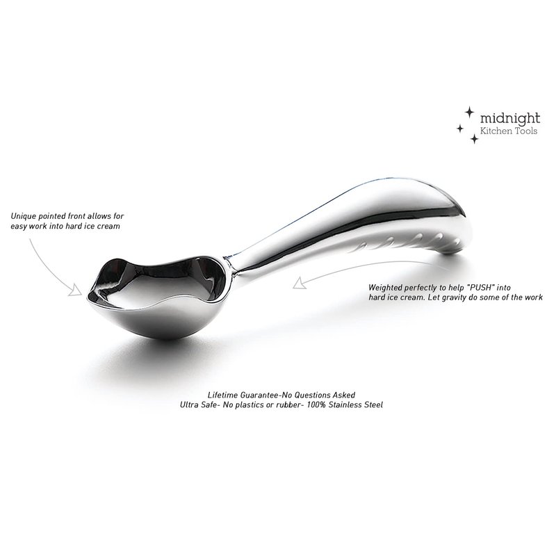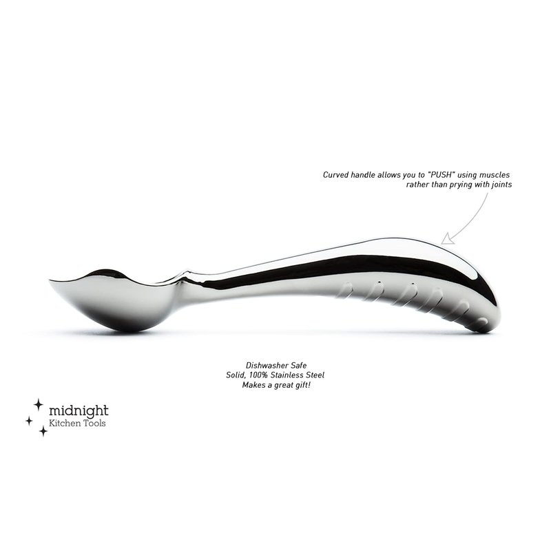 - You Have Been Scooping Ice Cream Wrong - Instead of prying at hard ice cream with weak wrists, the Midnight Scoop allows you to ergonomically push into the ice cream using your arms and shoulders for more leverage and power. It Makes a Huge Difference!