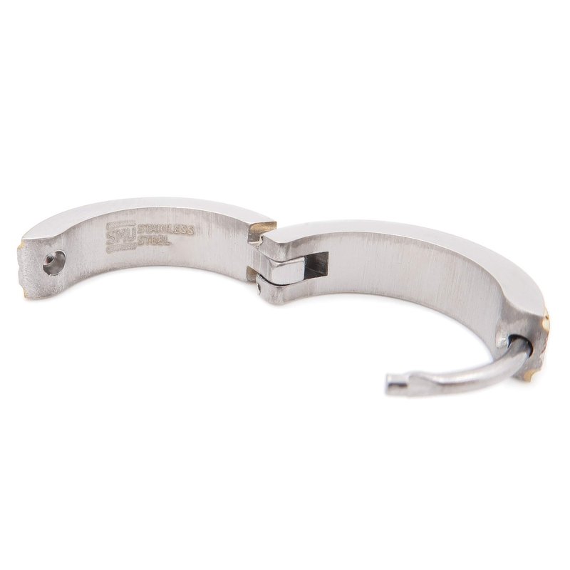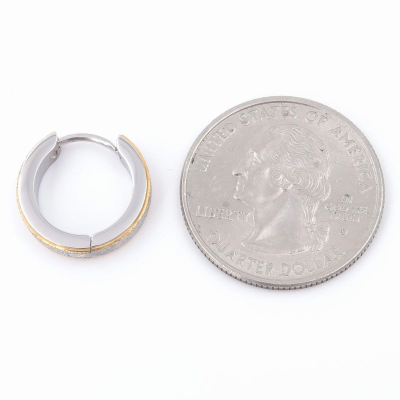 One pair of stainless steel hoop / huggie men earrings. Flat textured surface with stripes and gold color beveled edge. Hinged snap clasp. 16mm outer diameter, 4mm wide. Comes with a gift bag. ** The coin in the picture is a US quarter dollar, for size reference only and not included.