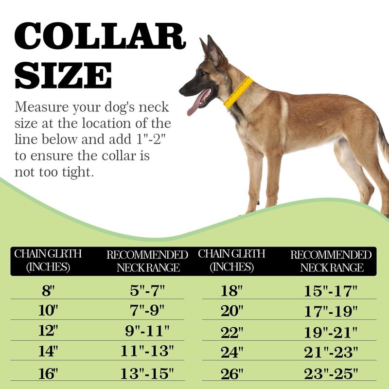 - [Collar Sizes]: Cuban link chain width is 15MM(0.6 inches); Total length are from 10 inches to 26 inches. Measure your dog's neck and add 1-2 inches for initial collar length for adjustment.