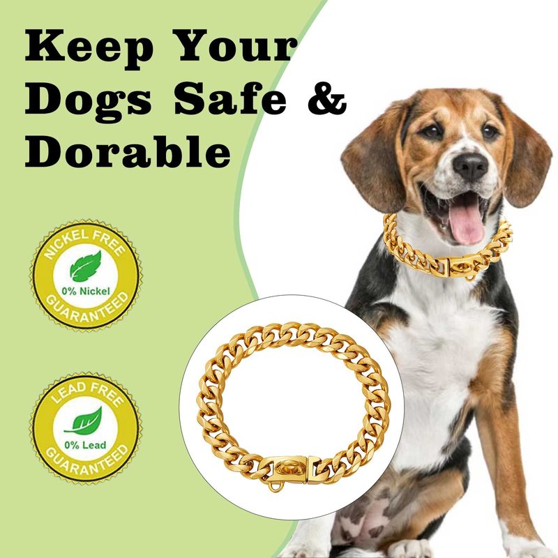 - [High-Quality Material]: Our gold dog chain collars are made of 316L stainless steel,18K gold plated with high strength and hardness, heavy, durable, no rust, no tarnished for years of use. The strong gold dog collar is suitable for all small medium and large dogs.