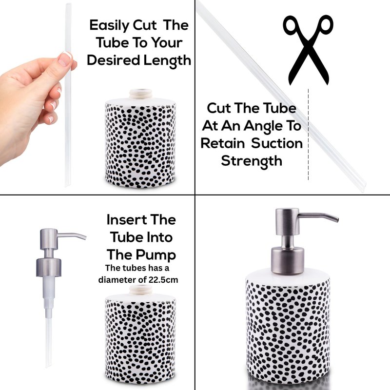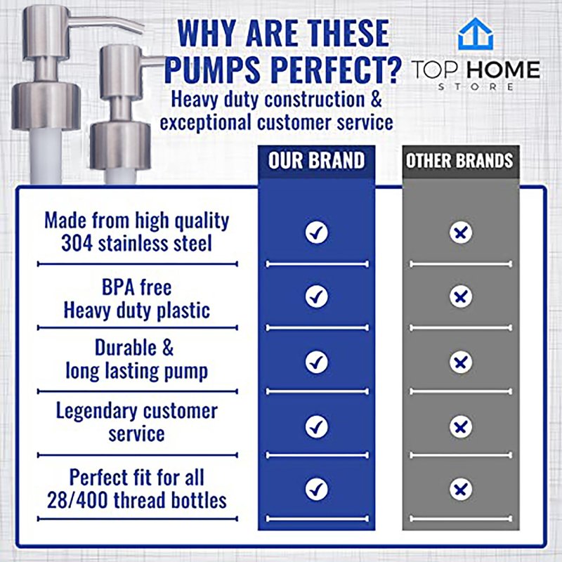 Constructed for high longevity from real metal, not plated plastic! 304 Stainless steel, with an internal stainless steel spring and glass ball for years of quality performance. The Soap pump's delivery is 2cc and has a thread size of 28/400. The tube size is 9 inch and can be cut easily to the desired length. The contents include 2 Stainless Steel Soap Pumps, and 2 nine inch Tubes