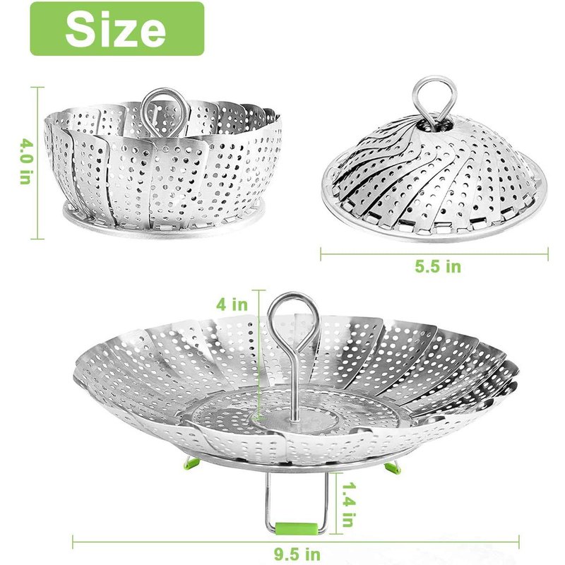 - ADJUSTABLE SIZES FITS VARIOUS POTS: This steamer could collapses for compact storage and expands to fit pots with a diameter of 5.5 inches and up to 9.5 inch, such as 3, 5, 6 & 8 Quart (qt) instant pots, Pressure cooker, pans, rice cooker, Air fryer